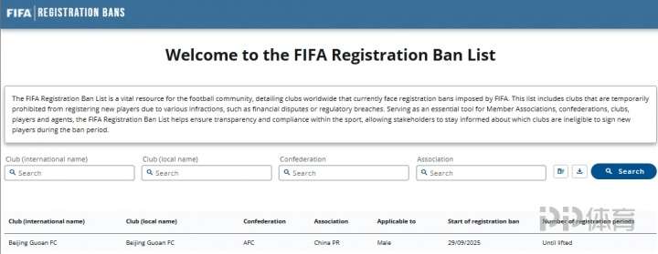 FIFA官方:国安收到转会注册禁令,处罚期为无限期,直至解决